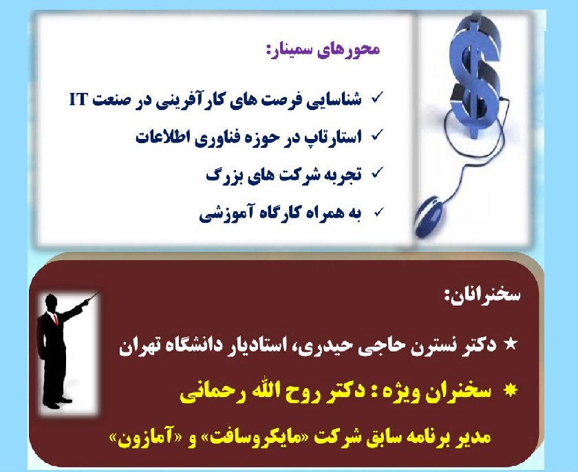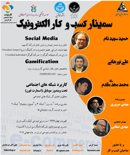 فیلم سمینار "کسب و کار الکترونیکی" با سخنرانی دکتر نسرین حاجی حیدری استاد دنشگاه تهران و دکتر روح الله رحمانی عضو هیات علمی دانشگاه و از مدیران اسبق شرکت های مایکرو سافت و آمازن سپید که در تاریخ 93/2/31 در دانشکده مدیریت دانشگاه تهران با همکاری انجمن های علمی دو دانشکده کارآفرینی و مدیریت دانشگاه تهران و شبکه اجتماعی کارنونت برگزار گردید. بر روی DVD آماده تحویل است.