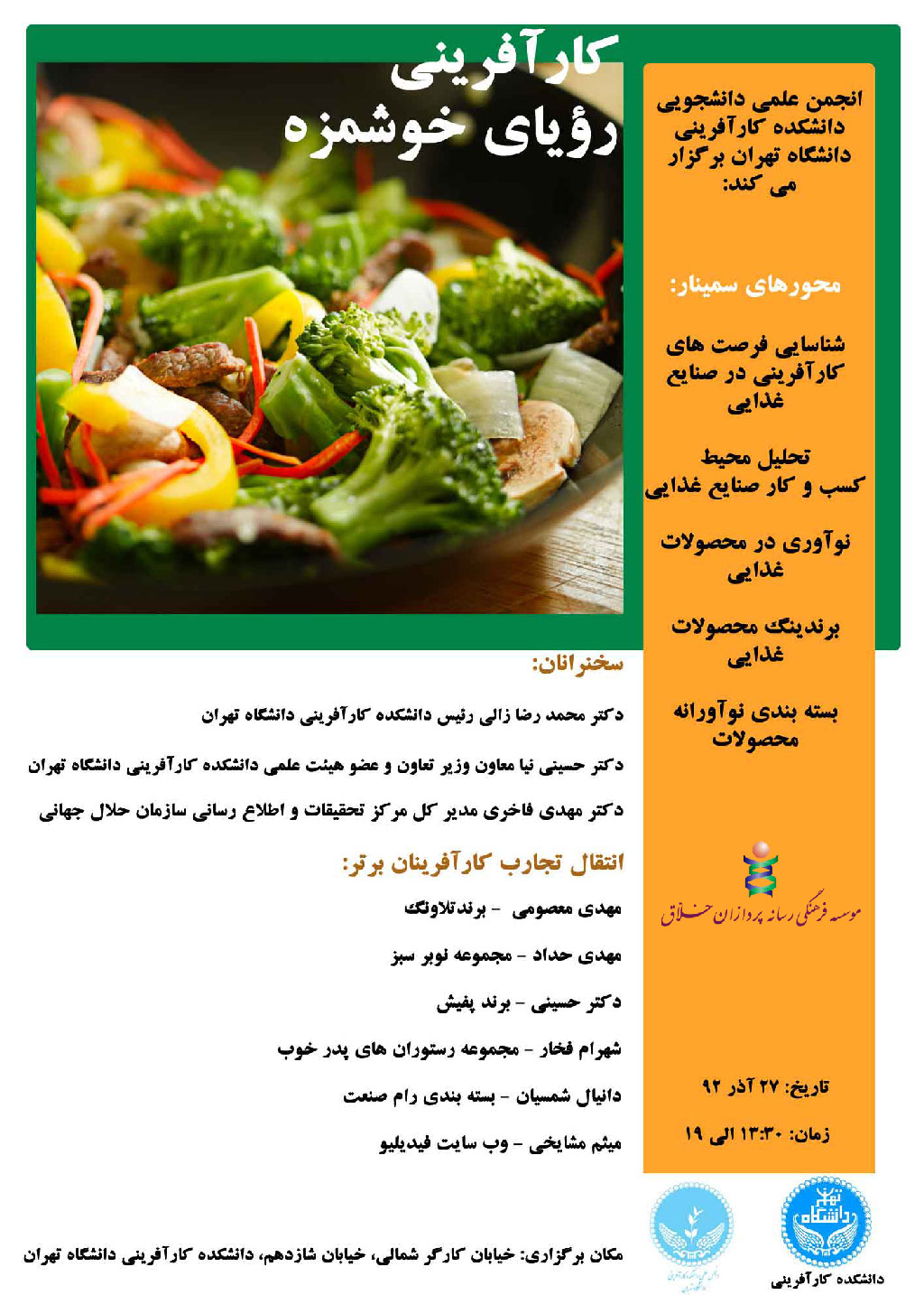 فیلم سمینار "کارآفرینی رویای خوشمزه با رویکرد فرصت شناسی و کارآفرینی در حوزه صنایع غذایی" با سخنرانی اساتید برجسته دانشگاه تهران و جمعی از خبرگان و صاحبان کسب و کارهای موفق در حوزه صنایع غذایی که در دانشکده کارآفرینی دانشگاه تهران برگزار گردید بر روی یک DVD آماده تحویل است.