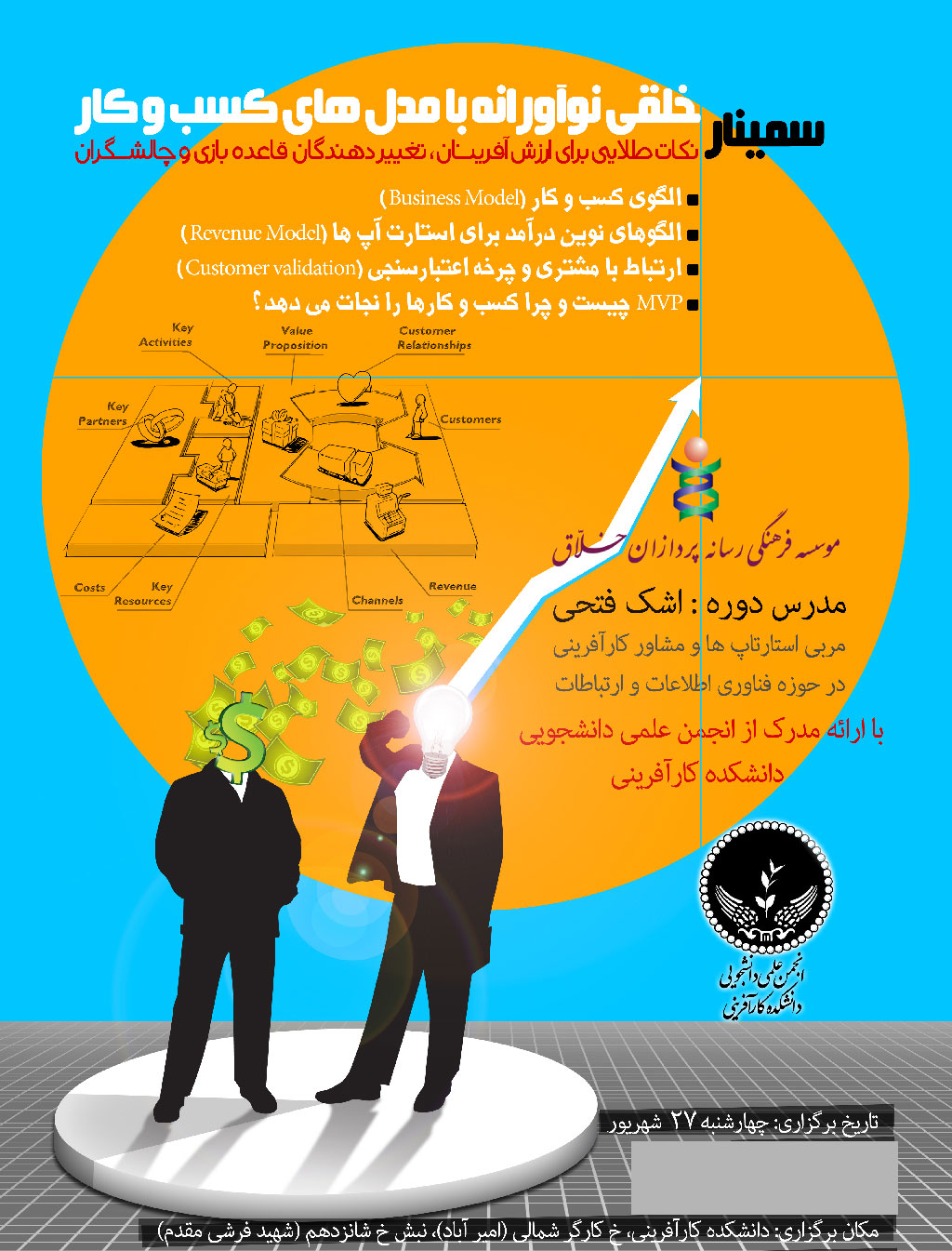 فیلم سمینار "خلق نوآورانه در مدلهای کسب و کار" با تدریس جناب آقای اشک فتحی که در دانشکده کارآفرینی دانشگاه تهران برگزار گردید بر روی یک DVD آماده تحویل است.